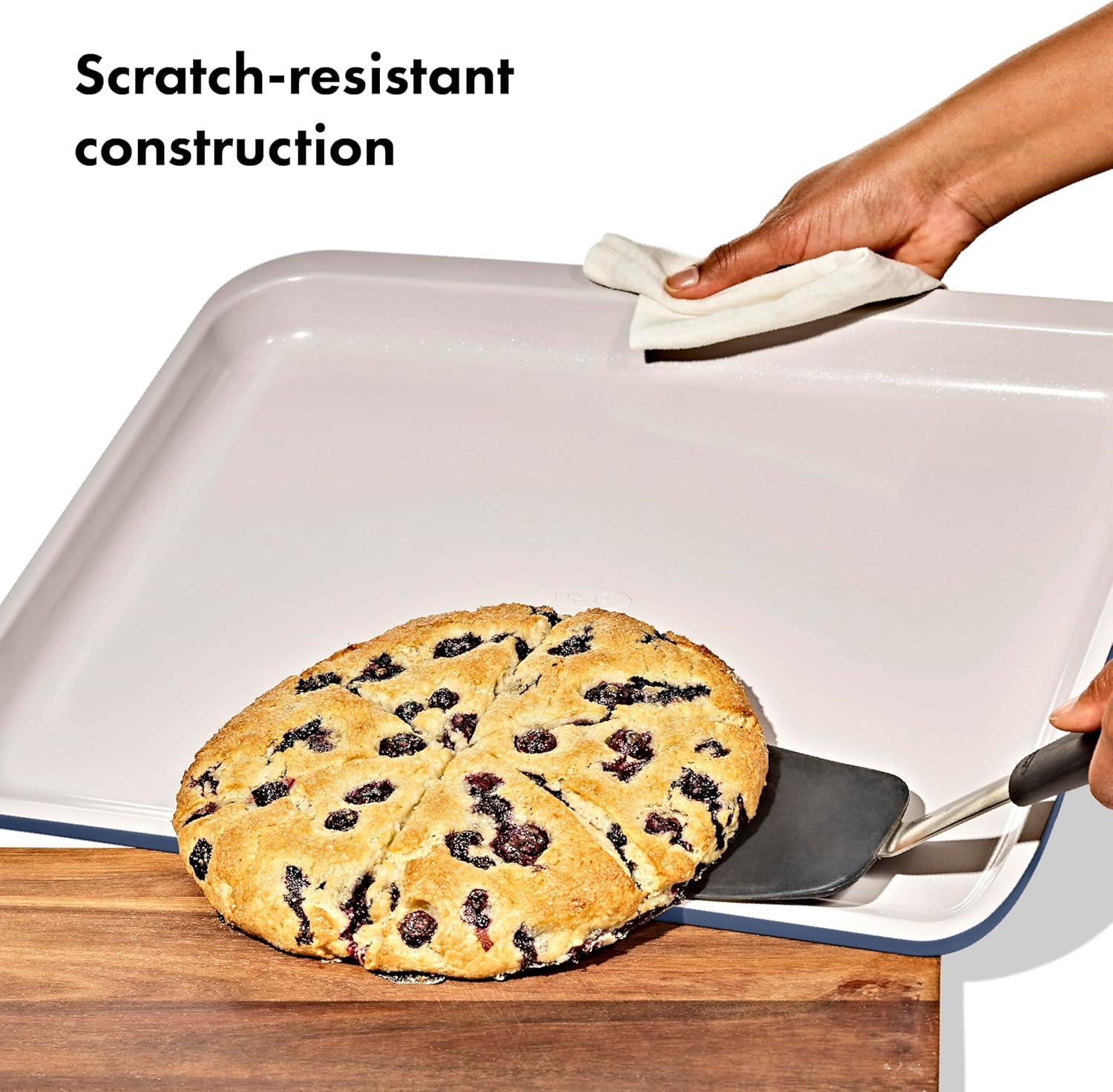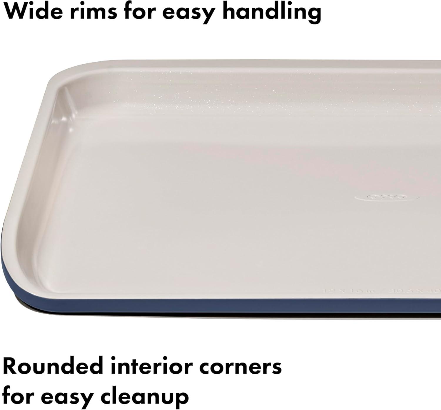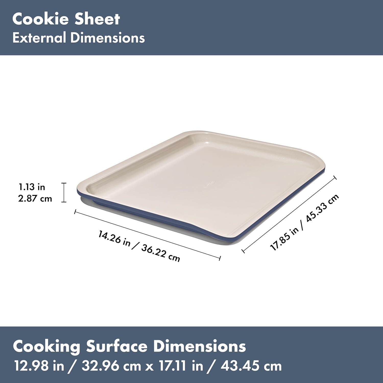 The OXO Non-Stick Pro Ceramic Coated Metal Bakeware Cookie Sheet is a bakeware solution that’s beautiful, durable and easy to clean. The cookie sheet provides versatility for baking and roasting – it’s ideal for baking a dozen cookies or a tray of fries. The efficient ceramic non-stick coating heats quickly and evenly, allows for easy food release and protects against scratching, staining, corrosion and abrasion. Get consistent results – the light interior coating color has been optimized for even browning for both sweet and savory baking. The bakeware is constructed from heavy-gauge aluminized steel for stability, even heat distribution and durability for years to come. The square-rolled edge adds structure and strength to the bakeware, and the wide rims provide a secure grip for easier handling in and around the oven. Each pan features pan dimension markings on the top surface, so you can find the right bakeware item for your recipe. Zero-draft walls on our cake pans allow for straight and uniform cake layers. Rounded interior corners allow for easier cleaning. Non-stick ceramic coating made without PFAS. Hand wash for best results. Cookie Sheet dimensions: External:14.26 in x 17.85 in • 36.23 cm x 45.34 cm | Internal: 12.98 in x 17.11 in • 32.98 cm x 43.45 cm.