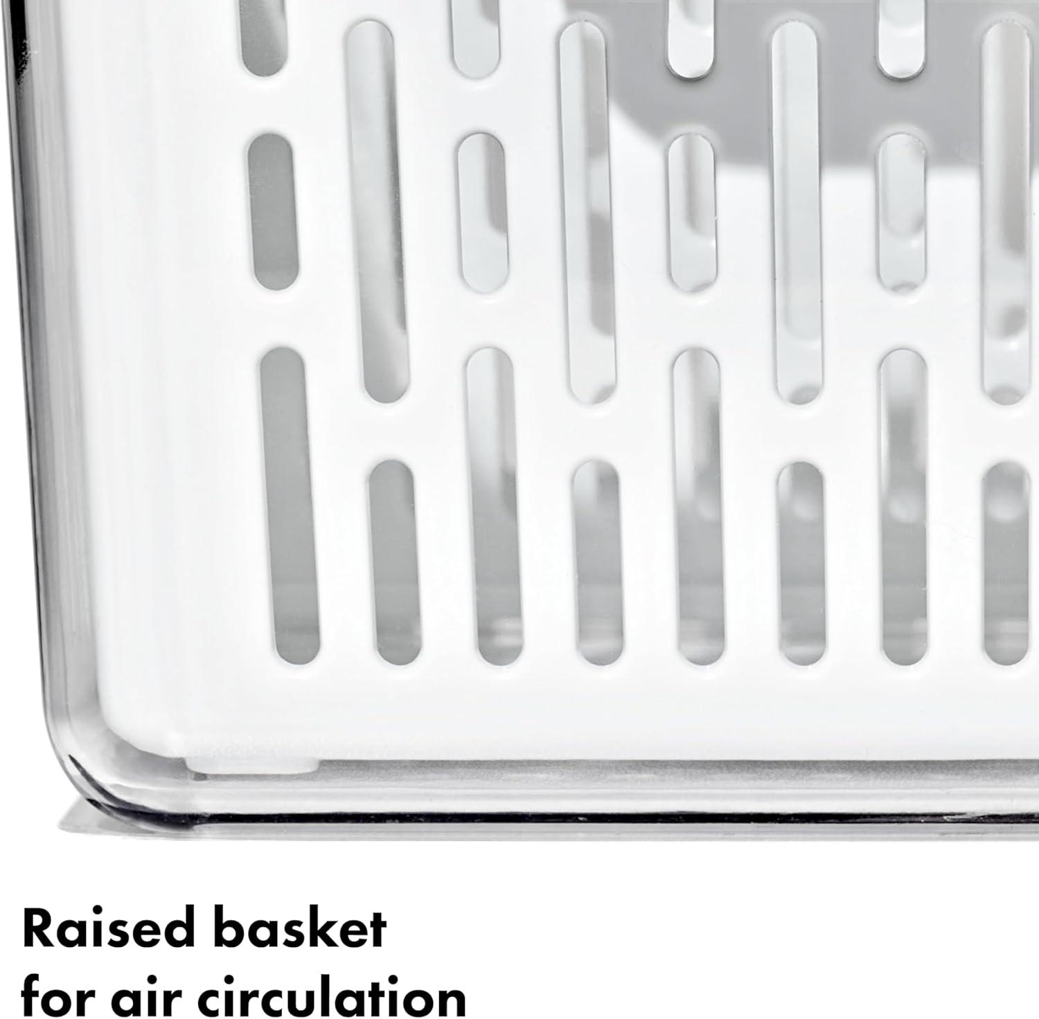 The OXO Produce Savers are fridge-friendly storage bins designed to keep your produce fresh longer. The Long Bin is the perfect size for carrots, cucumbers, eggplant, celery, scallions and other long veggies. The adjustable divider keeps produce organized and visible, which helps reduce food waste – no more finding a forgotten rotten veggie in the back of the fridge. The inner basket keeps produce elevated and promotes optimal air circulation to keep things fresh, and the basket is removable so you can use it to rinse produce. The Bin’s comfortable handle makes it easy to take the Bin to the counter, and the pivoting lid provides access whether you’re opening it in the fridge, or on the counter during prep. The Long Bin measures 14.8 in x 5.9 in x 3.6 in/37.6 cm x 15.1 cm x 9.1 cm; this BPA-free Bin is dishwasher safe and stacks with other OXO Produce Savers for modular, customizable organization.