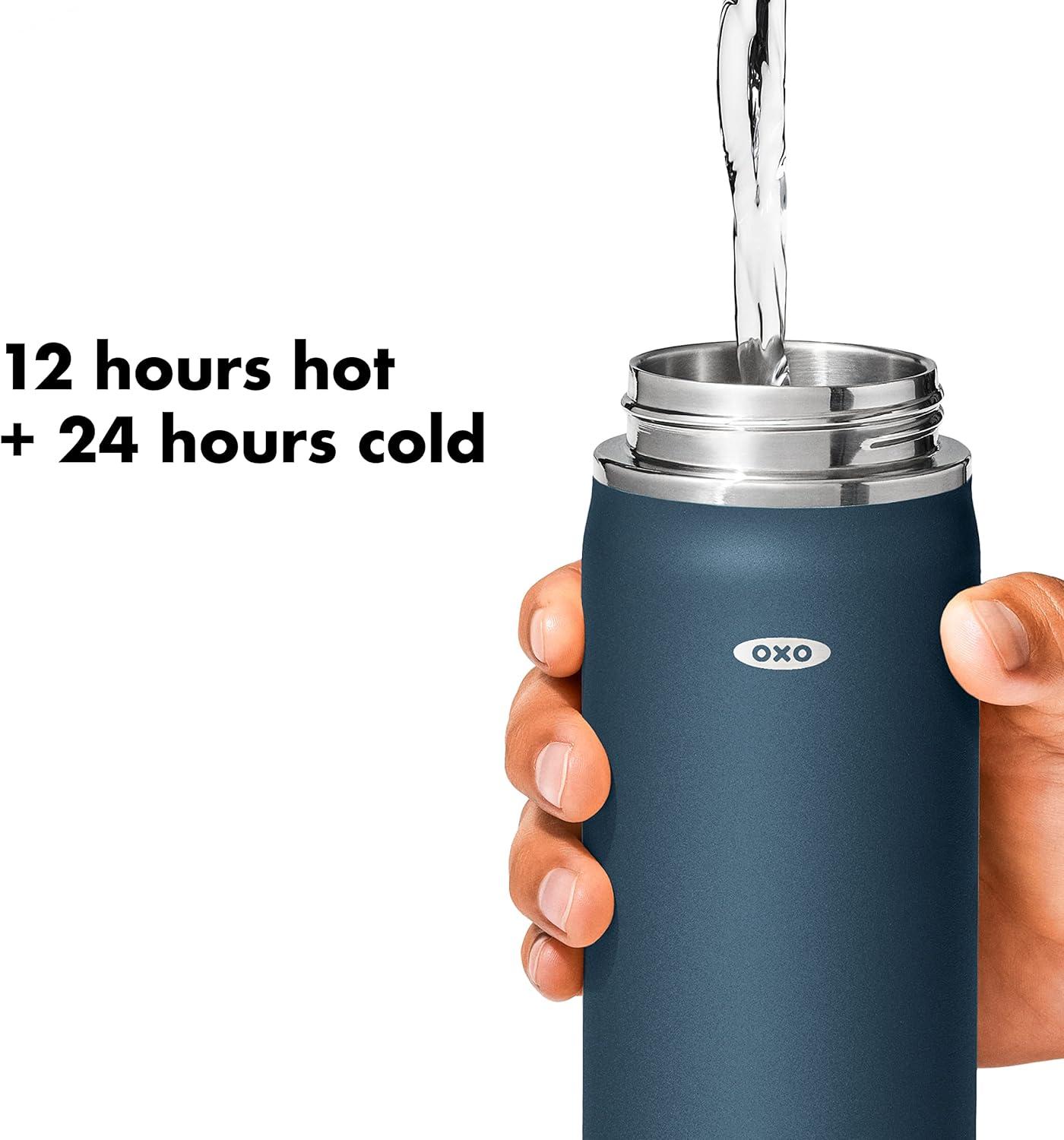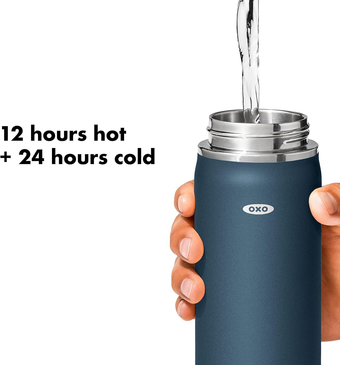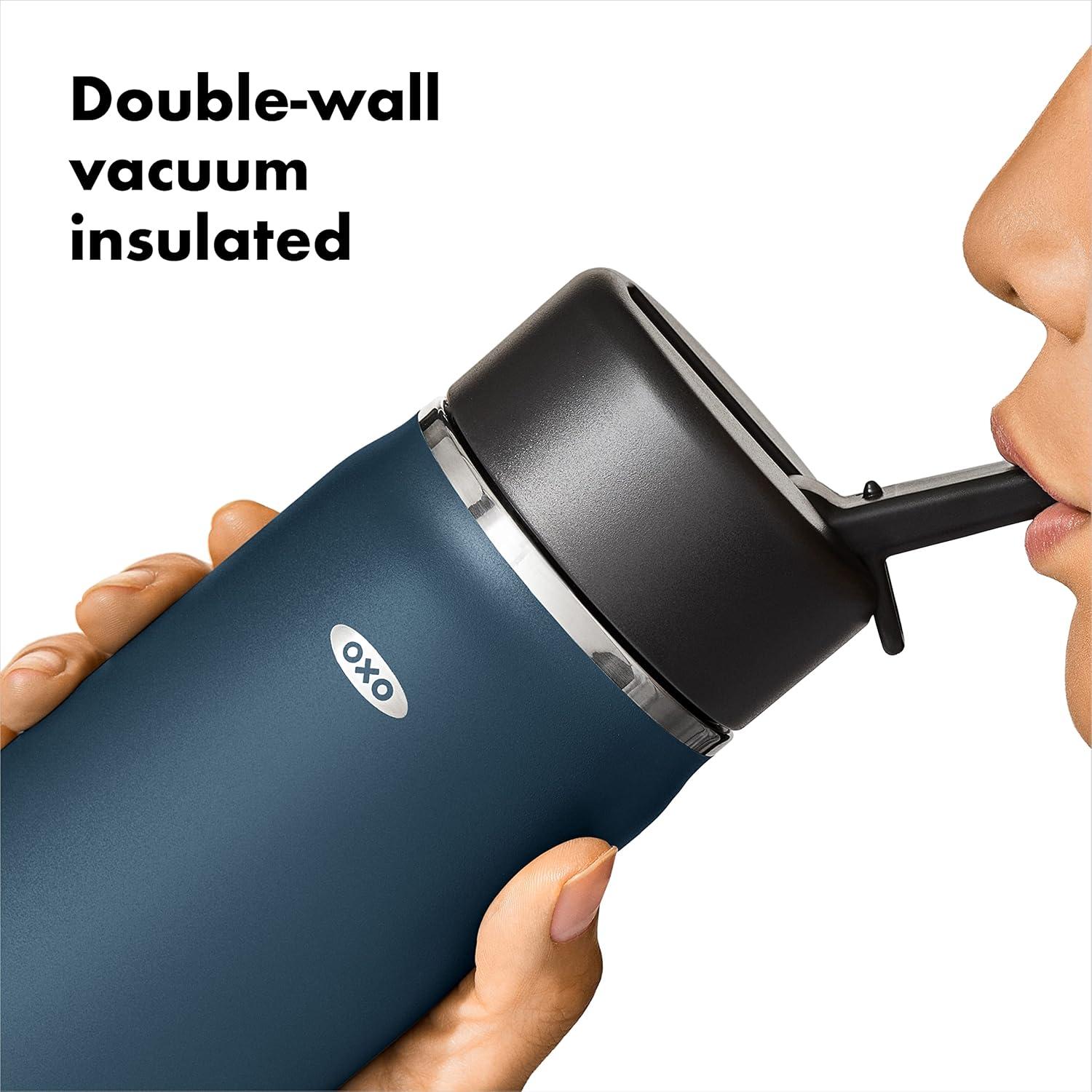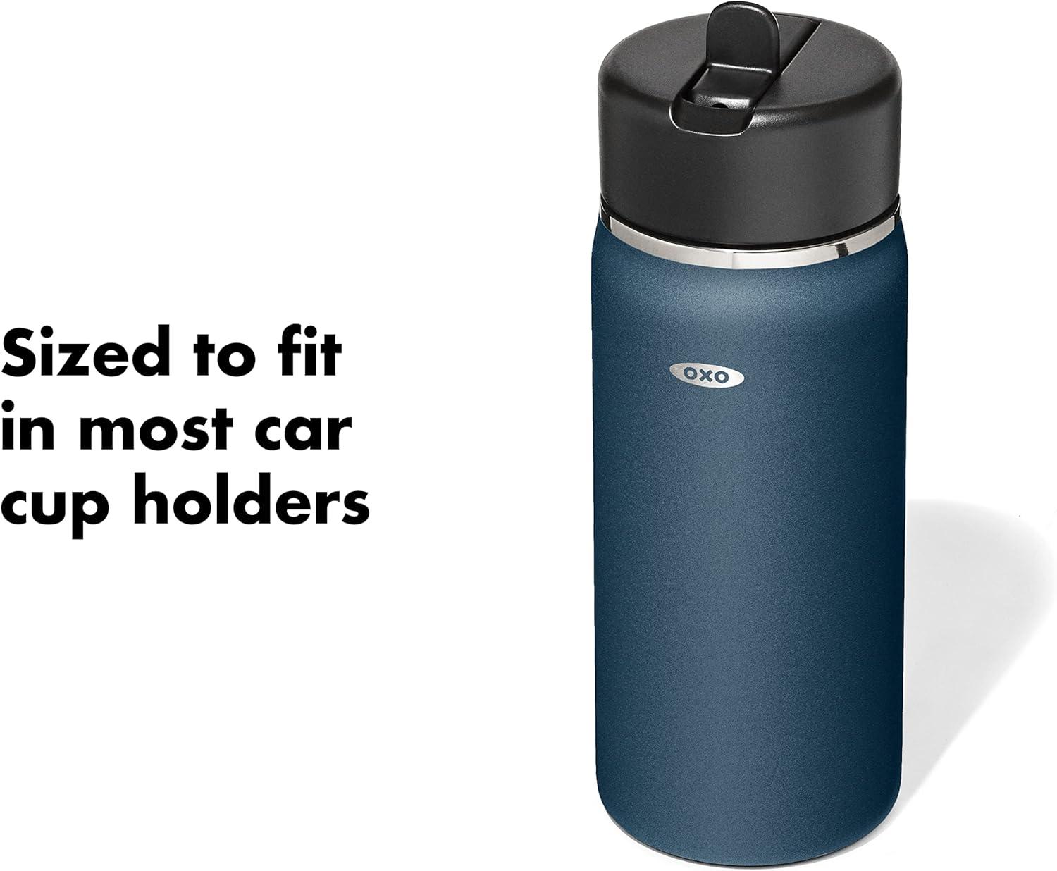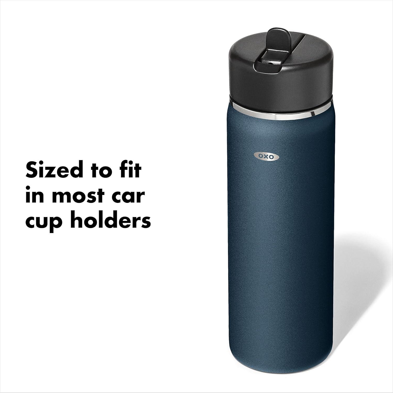 Sip with confidence knowing your drink will still be cold (or hot!) with the OXO Strive 24 oz/710 mL Insulated Wide Mouth Water Bottle with Straw Lid The Insulated Water Bottle is sized to fit most car cup holders and features a non-slip, sweatproof coating for a comfortable grip. The easy-to-clean lid features a removable silicone gasket, and the straw flips open for quick access and snaps closed to help prevent spills. Stainless steel, double-wall vacuum insulation keeps drinks cold for 24 hours or hot for 12 hours. The bottle and lid are dishwasher safe. BPA free.