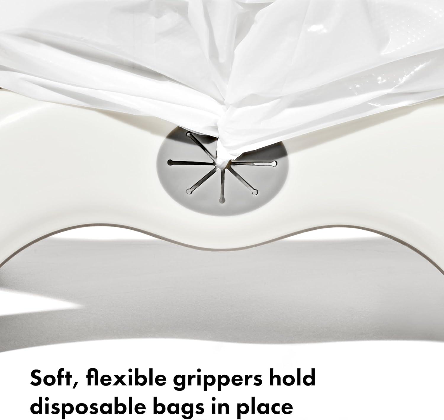 Be prepared for on-the-go potty emergencies with the OXO Tot 2-in-1 Go Potty. The Potty opens quickly and easily and works alone (with disposable bags), or as a seat that rests on top of toilets. The legs lock at the ideal height for growing tots, and soft, flexible flaps hold disposable bags securely in place. Three disposable bags with absorbent pads are included, and refills are available, plus the Potty can accommodate standard plastic bags in a pinch. The legs fold all the way out and non-slip grips keep the Potty stable on round or elongated public toilets. The small seat is sized for little bottoms and the generous shield prevents splatter. The smooth surfaces are easy to clean and the legs fold in, allowing the Potty to fit into the included travel bag for storage in cars, strollers or diaper bags.