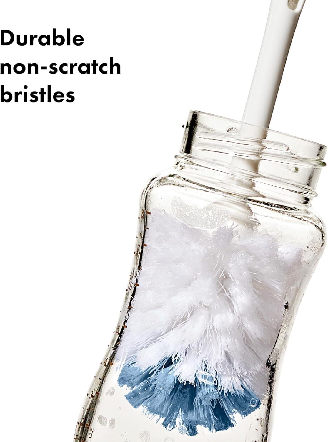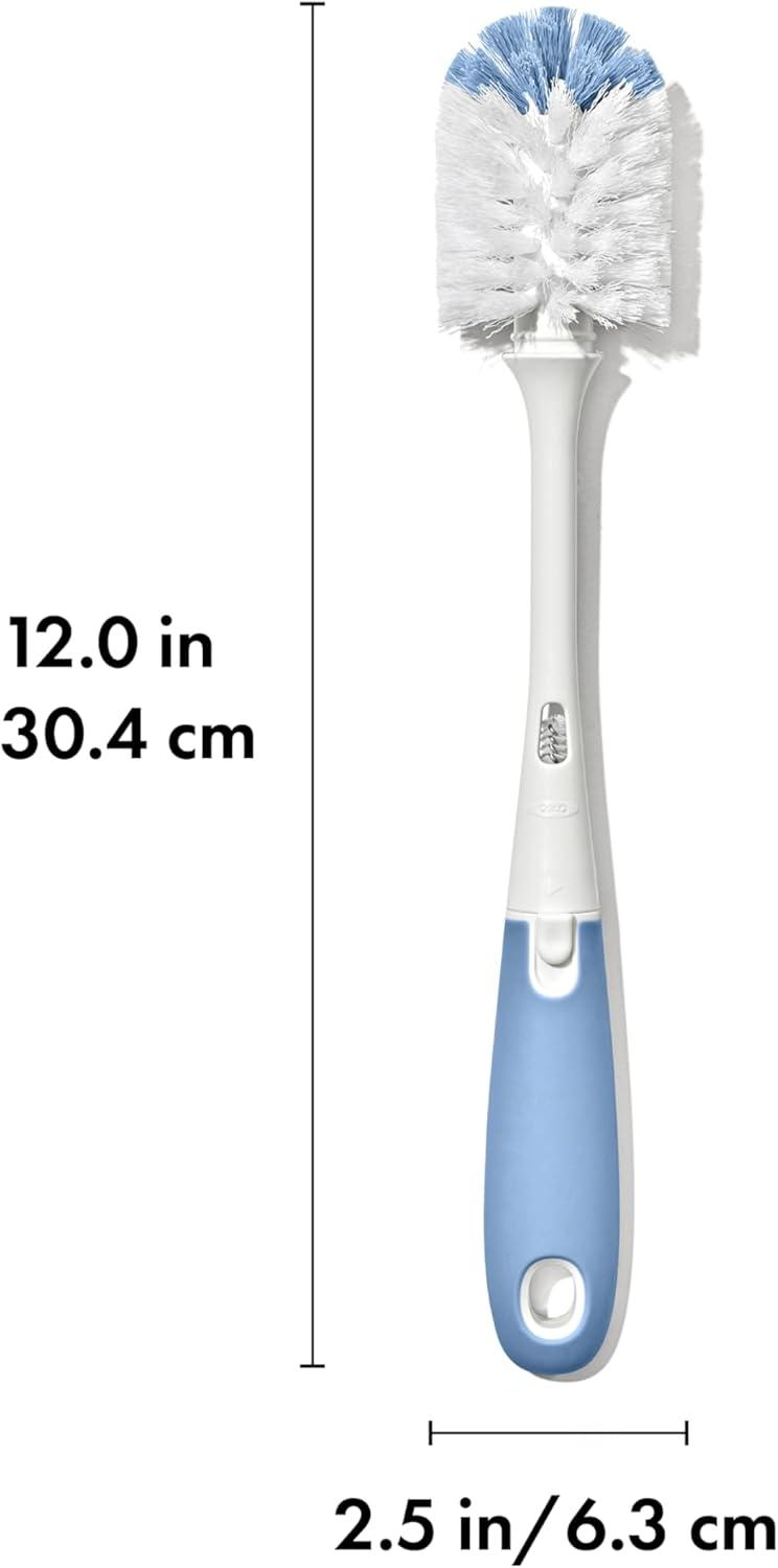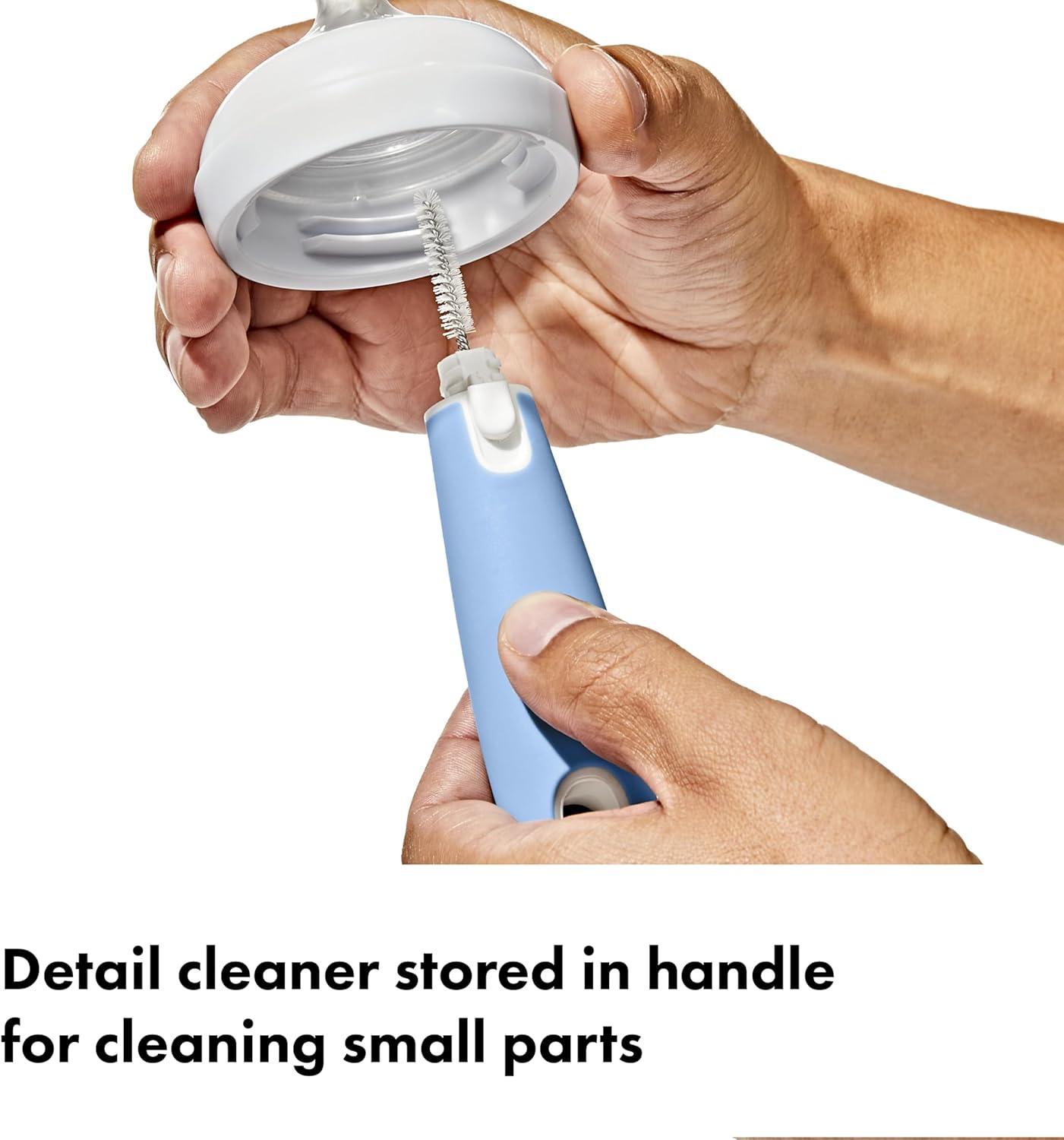 The OXO Tot Bottle Brush with detail cleaner is ideal for deep cleaning baby bottles and more. The brush head includes both soft and firm bristles for gentle cleaning and serious scrubbing. The flexible handle features a non-slip grip so you can clean in comfort, even with wet hands. A hidden detail cleaner is made of soft but sturdy silicone and is perfect for hitting tight spots inside bottle nipples and breast pump parts. BPA and PVC free. Dishwasher safe.