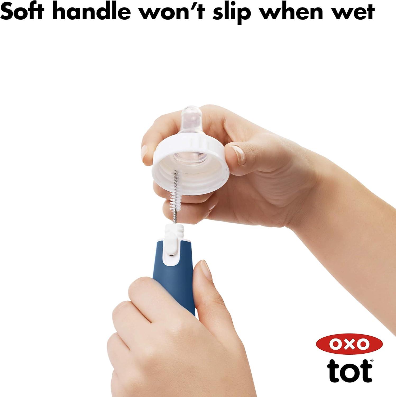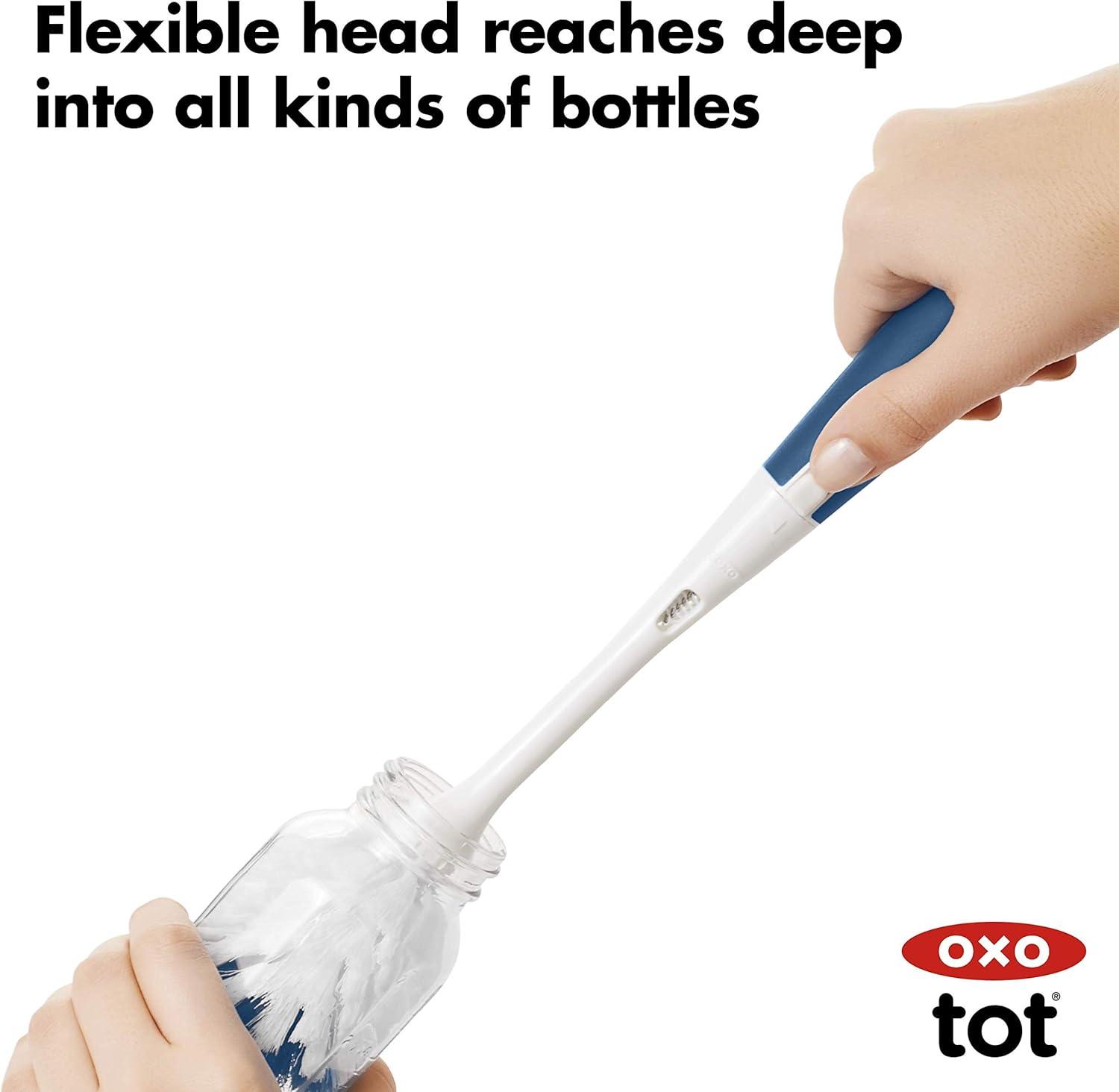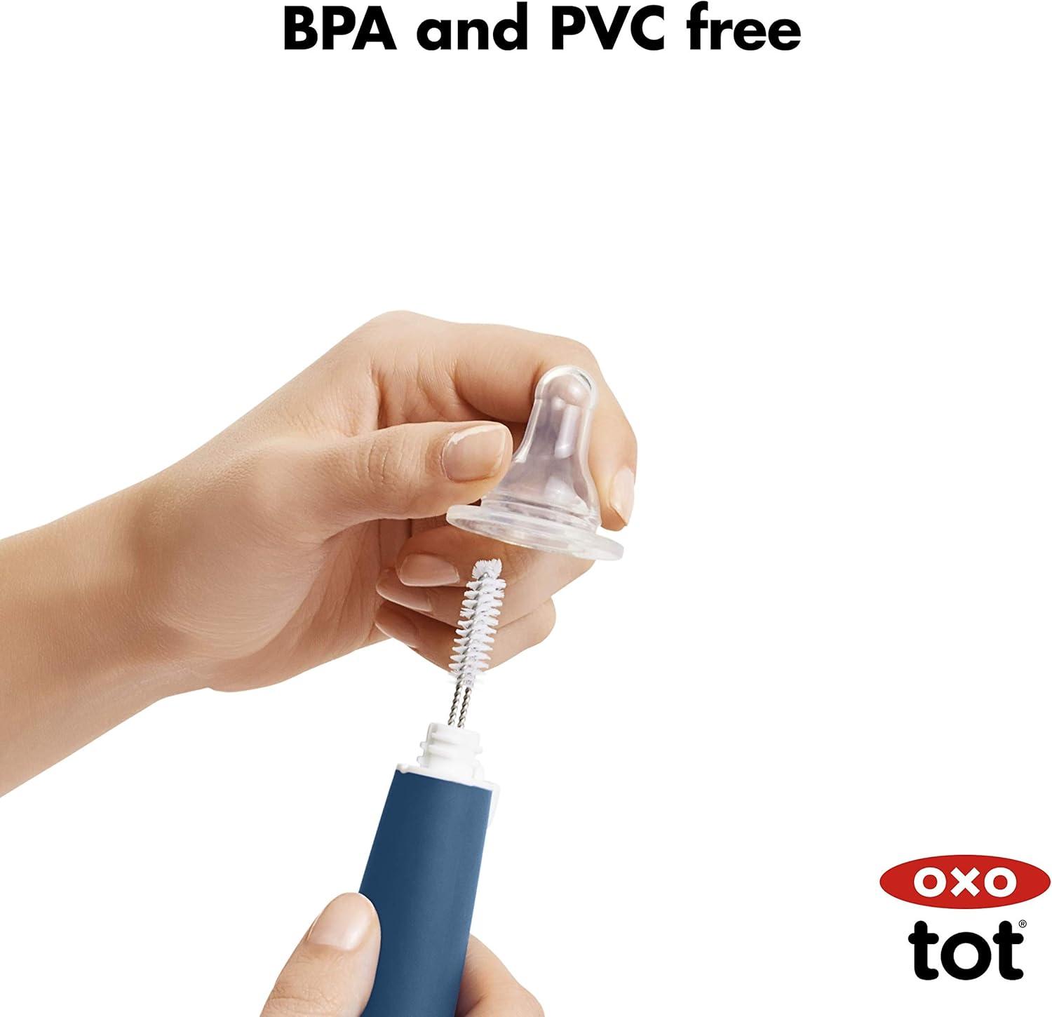 The OXO Tot Bottle Brush with detail cleaner is ideal for deep cleaning baby bottles and more. The brush head includes both soft and firm bristles for gentle cleaning and serious scrubbing. The flexible handle features a non-slip grip so you can clean in comfort, even with wet hands. A hidden detail cleaner is made of soft but sturdy silicone and is perfect for hitting tight spots inside bottle nipples and breast pump parts. BPA and PVC free. Dishwasher safe.