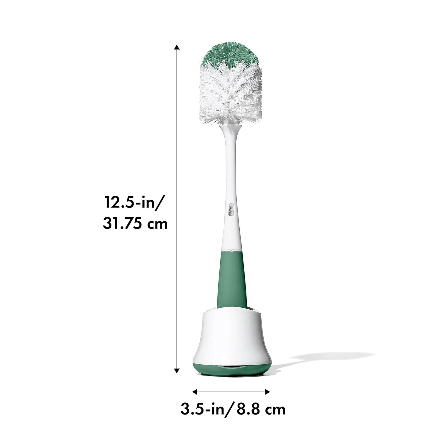 The OXO Tot Bottle Brush with Stand is the ideal tool for cleaning baby bottles. Combining soft bristles for gentle cleaning and firm bristles for serious scrubbing, this handy bottle cleaner brush has a flexible neck to easily reach inside contoured bottles. The bottle cleaner brush bristles are durable and won't cause scratches. Replacement brush heads are available separately. The flexible handle features a nonslip grip so you can clean in comfort, even with wet hands. And the handle is firm, so it will hold up to serious scrubbing of baby bottles and breast pump parts. A hidden detail cleaner built into the handle is made of soft but sturdy silicone and is perfect for hitting tight spots inside bottle nipples and the like. Ventilation holes help the detail cleaner dry quickly. The OXO bottle brush fits easily in the stand for convenient, upright storage – keeping your countertop neat and the bottle scrubber easy to access when washing baby bottles and their parts. The bottle brush fits securely in the stand which catches drips to keep your countertop dry. The stand has a handy pour spout to dispose of drips and the stand twists apart for easy cleaning. This product is made without BPA, PVC or phthalates. Each OXO Tot product is tested in real homes with real parents and children (including our own) to ensure that we provide only the best-designed products possible. We proudly use these products daily and it is our sincere hope that they exceed your expectations.