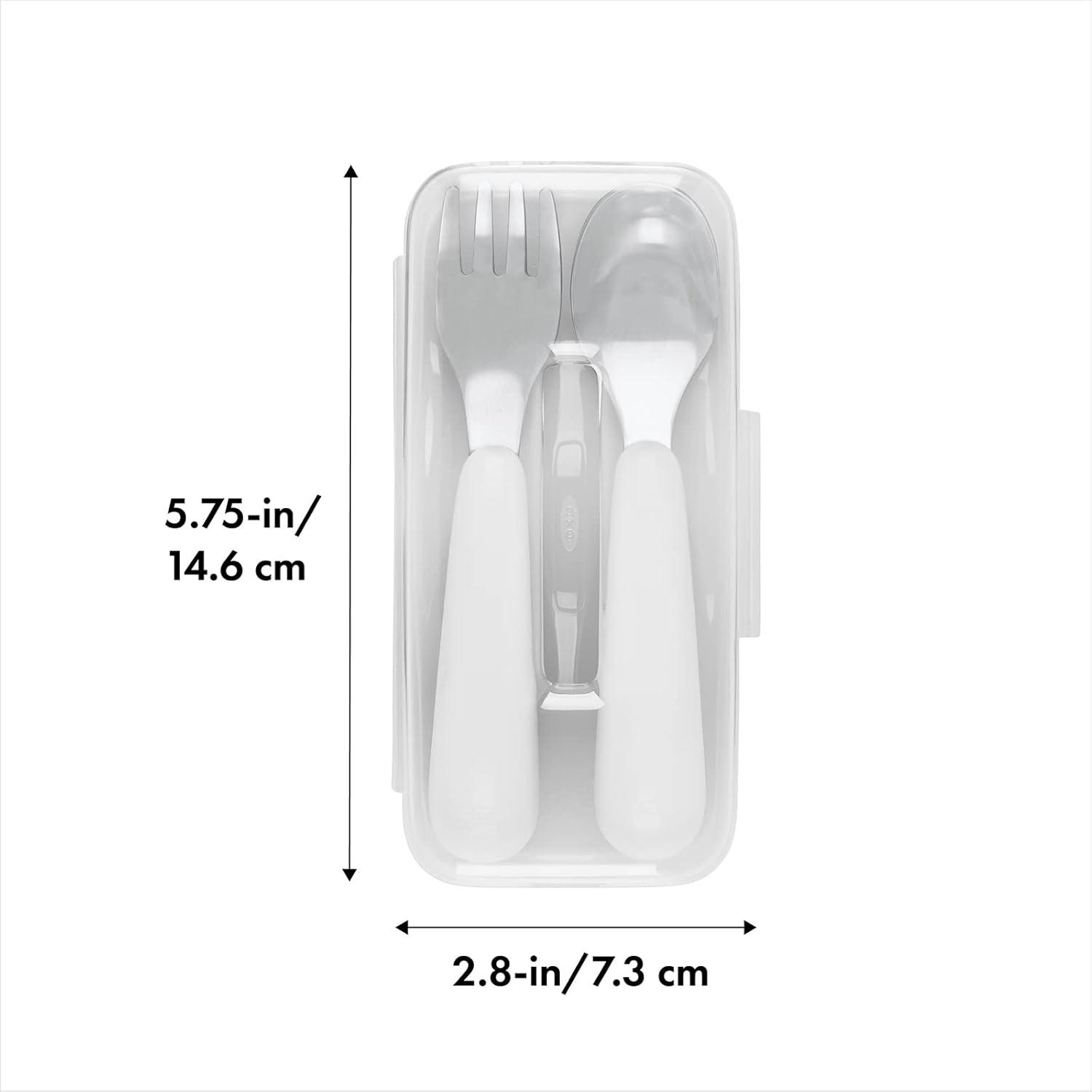 The OXO Tot On-the-Go Fork & Spoon Set was designed for meals while out and about—whether that’s a picnic in the park, at school or just in the backyard. The stainless steel Fork tines are rounded (to protect little fingers) but can still spear food, and the matching Spoon is extra-deep for optimal scooping. The curved, non-slip handles are easy for learning hands to hold and feature a flat spot to keep the utensils from rolling away. Plus, the compact Carrying Case can be easily tucked into lunchboxes, diaper bags, purses or pockets. Dishwasher safe. Now available in new colors!