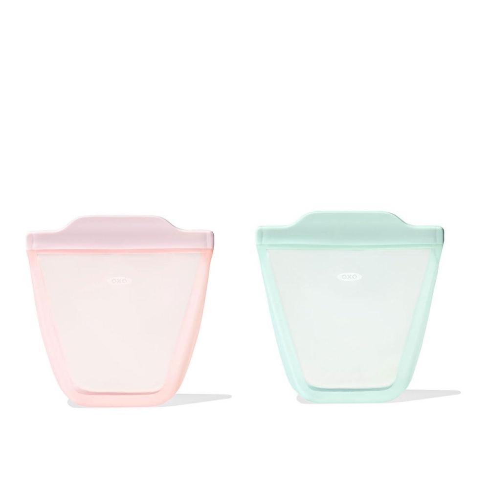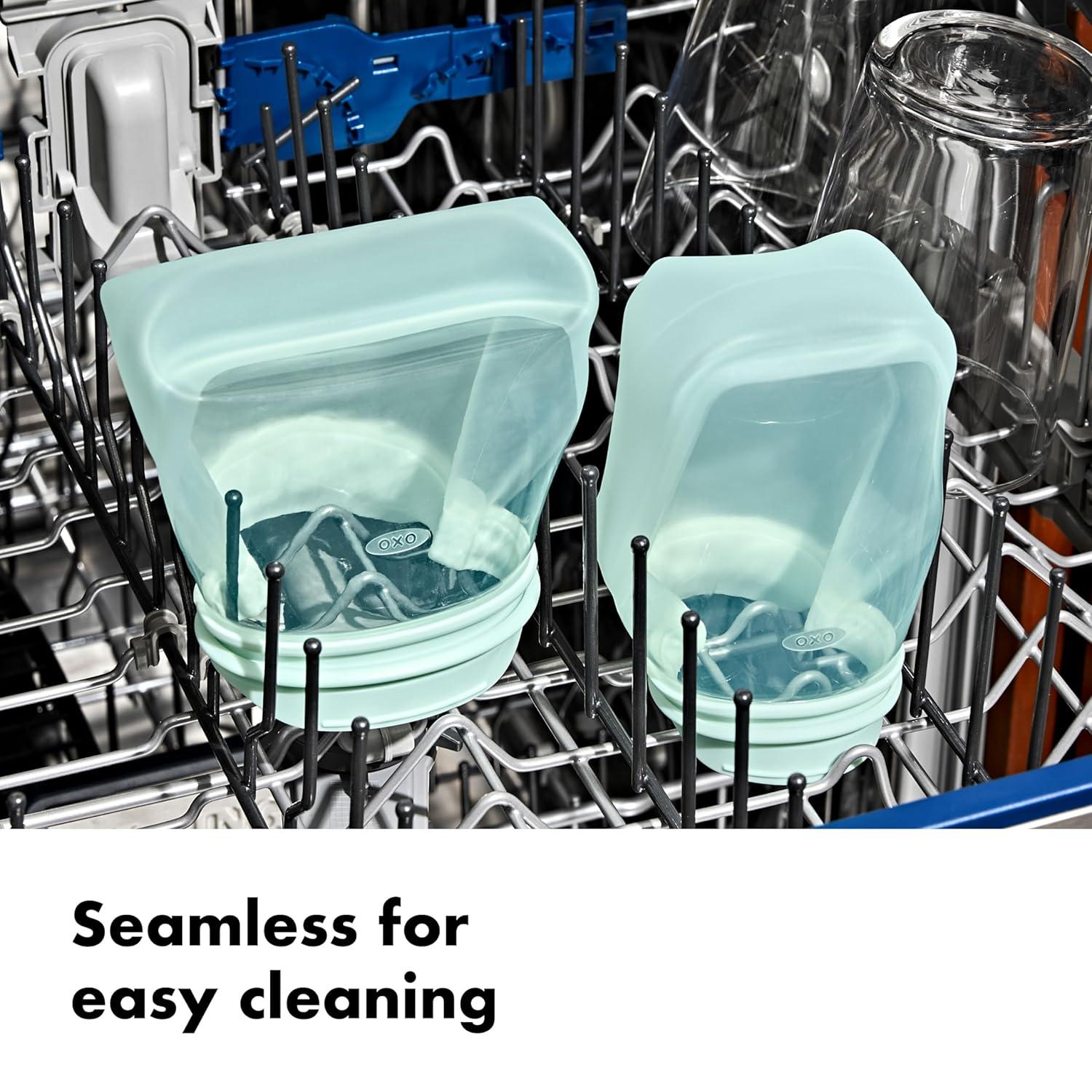 ake snacktime to the next level with a reusable alternative to finicky, single-use plastic baggies. The OXO Tot Silicone Reusable Bags keep snacks fresh with a strong seal, and are seamless for easy, thorough cleaning. They flip inside out to get fully clean in the dishwasher or by hand. The Stand-Up Cups have a flat bottom and a wide opening for filling and snacking with less fumbling, whether you’re filling the 8 oz./235 mL Stand-Up Cup with dry cereal or sliced grapes, or the 12 oz./355 mL Snack Bag with small crackers or a sliced apple. These Cups are also great for keeping small toys or baby accessories from getting lost at the bottom of bags. Freezer, microwave, and oven safe. BPA-free, PVC-free, and Phthalate-free food-grade silicone.
